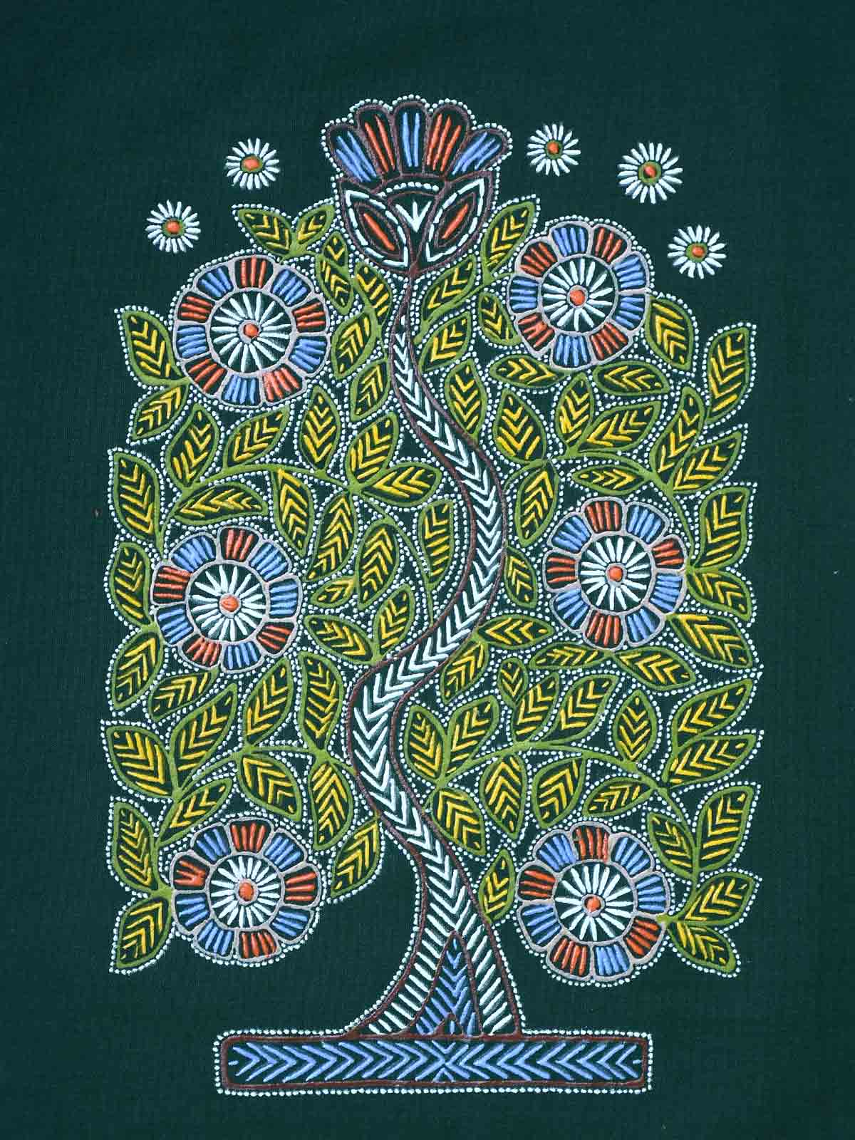 The Liquid Thread Rogan Art Wall Hanging By Kutch Artist celebrates the Rogan tree of life motif executed in traditional Rogan technique. Painted by Ashish Kansara on pure green cotton, this 7 x 11 inch unframed artwork highlights flowing tree motifs, intricate dot work and rhythmic line patterns distinctive to Rogan chhap (Rogan painting). Ideal for compact wall displays or as part of a curated set, the high-contrast background intensifies the pigment work and textured strokes. The piece blends cultural authenticity with modern sensibility—an excellent choice for collectors of Indian folk arts and those seeking unique handmade wall décor.